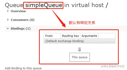 此时并没有指定交换机绑定,点击队列名看详情中的Bindings,有一个默认的交换机已经和队列进行绑定: