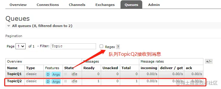 两个消息都发布成功,而是指定对应的RoutingKey进行投递,所以现在绑定到此交换机上两个队列中分别有一条数据,查看队列的消息概况: