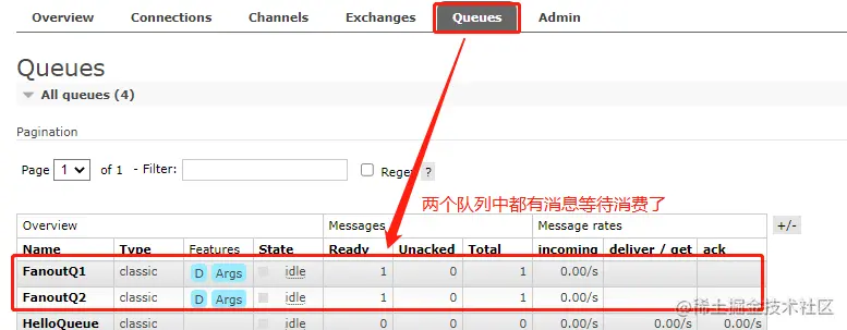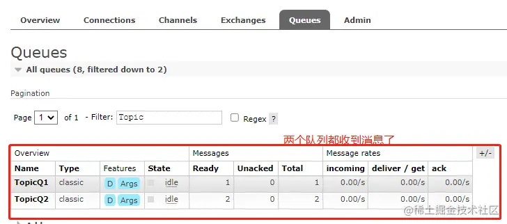 查看队列消息情况,可以看到两个队列都接收到消息了。