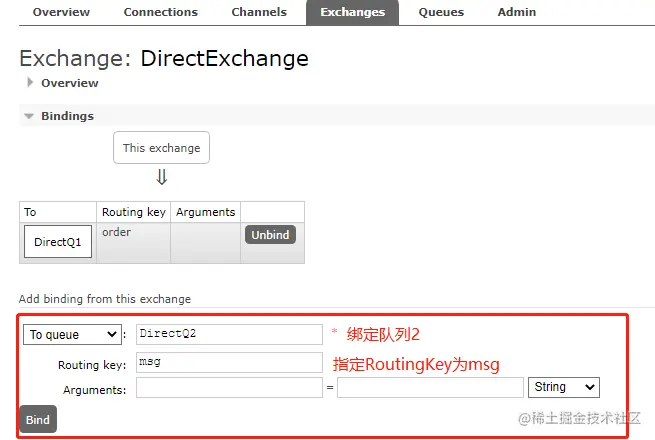将队列绑定到交换机上,这里还是在交换机详情中进行演示,如下: