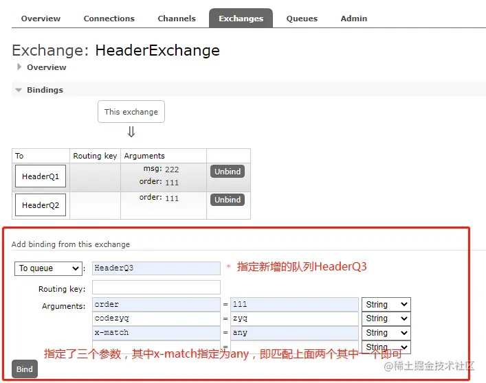 这里继续新增一个HeaderQ3的队列,创建方式和上面不一样,只是在绑定交换机的时候增加x-match 为 any,如下: