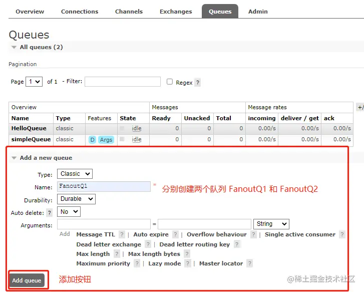 这里演示就创建两个队列,分别是FanoutQ1和FanoutQ2