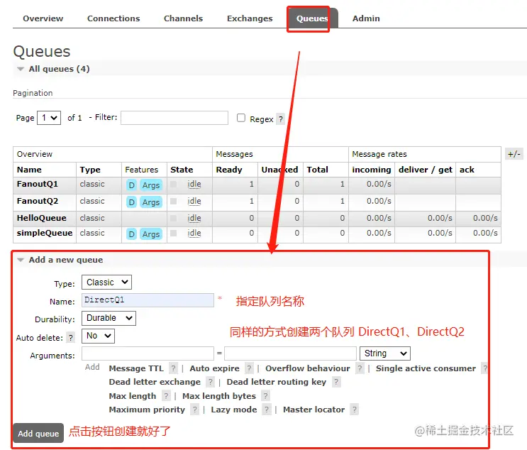 根据上图所示,我们只需要创建一个队列即可,然后就可以进行消息模拟发送和消费了。