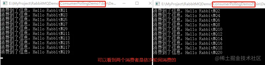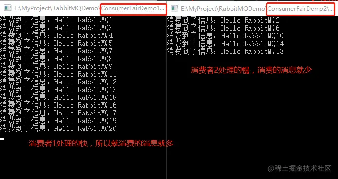 两个消费者的代码都是一样,没有变动; 两个消费者的都是在消费同一个队列的消息,可以先启动两个消费者,然后在启动生产者,效果如下: