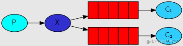 - X:表示交换机,图中表示一个交换机绑定了多个队列;