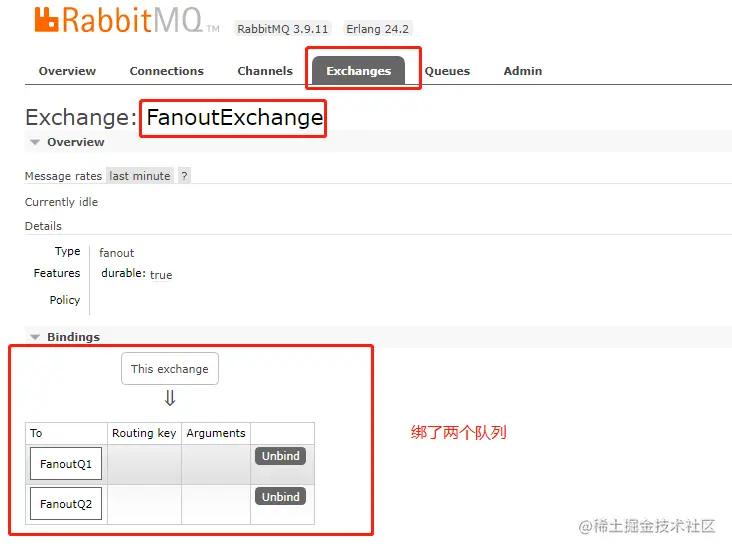 同样的方式绑定FanoutQ2, 绑定完成之后,可以在交换机详情页看到对应的绑定队列: