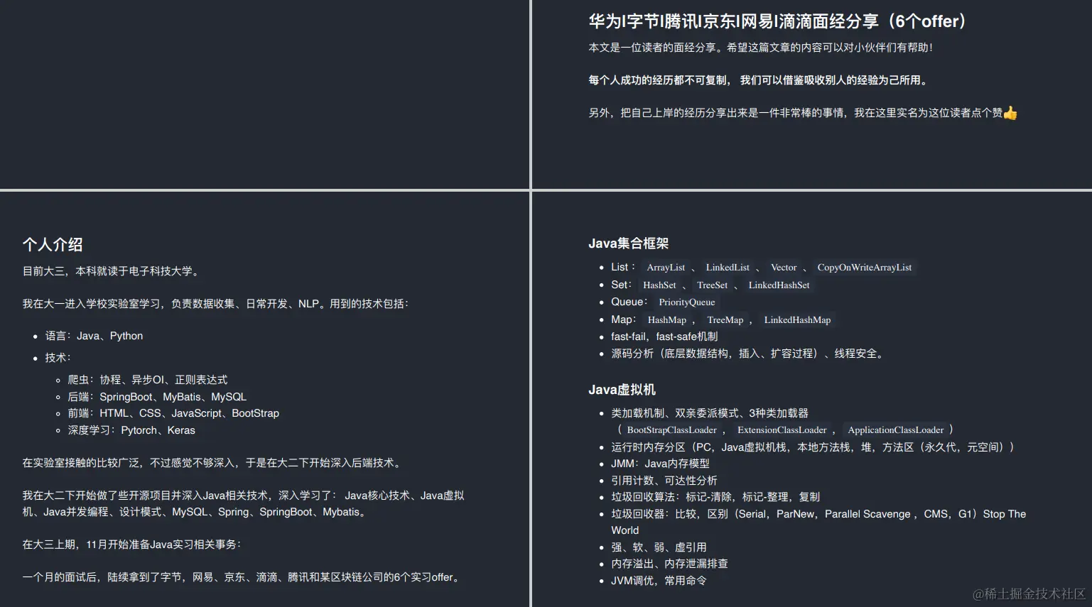 - Java 核心知识总结;2. 面试方向:面试题、面试经验、备战面试系列文章以及面试真实体验系列文章