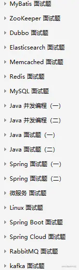 > 这份PDF面试文档包含了Kafka、RabbitMQ、Linux、Spring、SpringBoot、SpringCloud、SpringMVC、微服务、并发编程、MySQL、Redis、Memcached、Elasticsearch、Dubbo、Zookeeper、Mybatis、算法与数据结构****等,由于篇幅有限,这里以图片的形式给大家展示一部分。有需要的小伙伴可以评论区“滴滴”即可!感谢支持!!