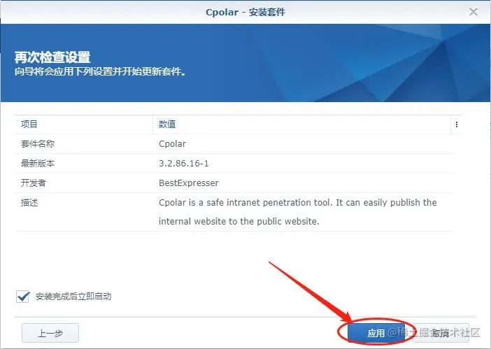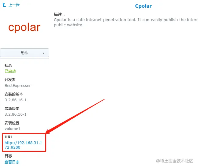 Cpolar套件安装完成后,我们可以在套件信息页面,点击URL地址,打开cpolar的web-UI界面,对能够连接群晖NAS的数据隧道进行设置。