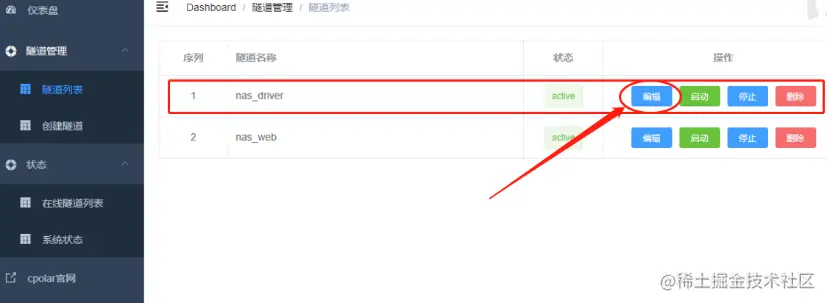 在进入cpolar客户端后,我们能看到cpolar已经自动建立了两条样例数据隧道,分别对应访问群晖存储的数据,以及发布群晖上的网页。由于我们的目的是远程访问内网群晖NAS,因此选择nas-driver隧道,点击这条隧右侧的“编辑”按钮,对其进行本地设置。