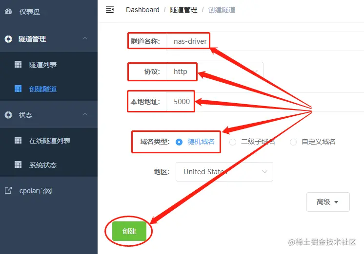 在这条隧道编辑页面,我们可以对几乎所有设置进行变更。如隧道名称、协议、本地地址、域名类型等等。不过,我们这里仅修改协议、本地地址两项即可。首先是将“协议”由原来的tcp协议更改为http协议,使群晖能通过公共互联网访问;接着将隧道名称更改为NAS-SSH,方便我们进行隧道区分;而端口则可根据实际使用情况,更改为未被占用的端口。这个例子中,我们选择5000端口。完成这几项变更后,即可点击下方的“创建”按钮,生成一条能够连接群晖NAS的数据隧道。