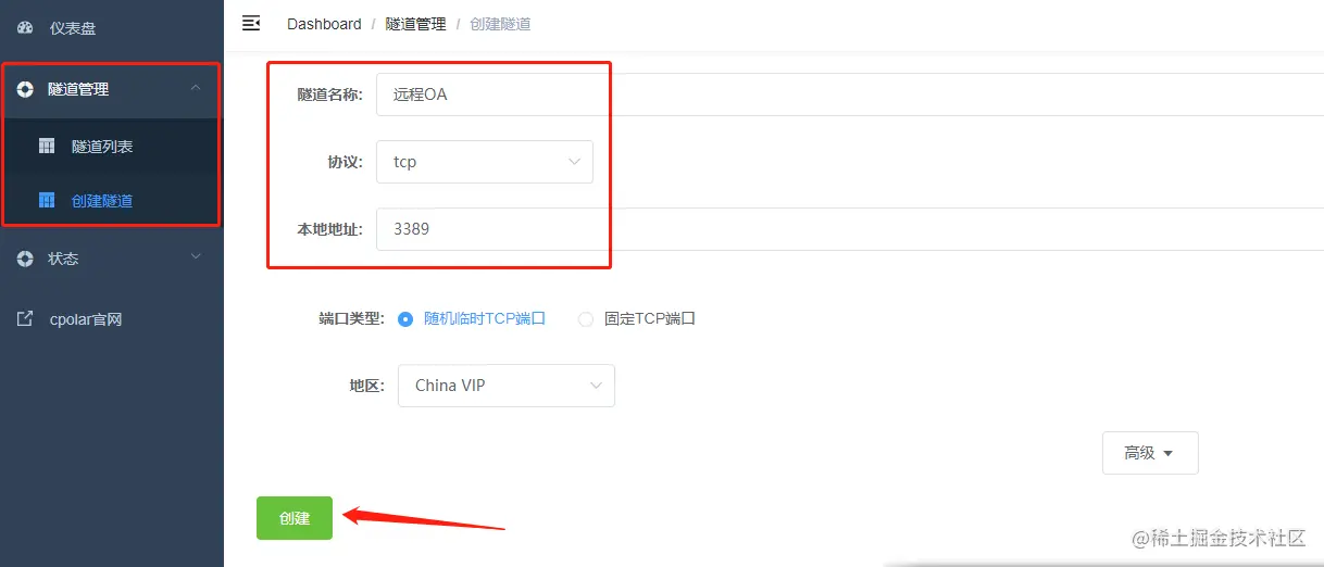 在cpolar主页面,我们点击左侧“隧道管理”项下的“创建隧道”,创建一条能够远程连接到办公电脑上OA系统的数据隧道。这条数据隧道的名称就将其命名为远程OA,协议选择为TCP协议,本地地址填写需要映射的内网端口即可,如本例中为远程桌面,则填写远程桌面的端口号3389,地区则填写为实际使用的地区,这里我们选择China VIP。完成这几个栏位的填写后,就可以点击下方的“创建”按钮,生成这条数据隧道。