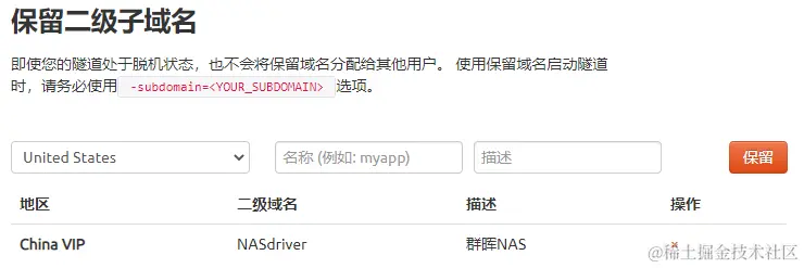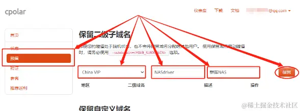 在这个栏位,我们需要对“地区”、“二级域名”、“描述”三个选项进行设置。地区我们可以选择cpolar的实际使用地(这里我们选择China VIP);而二级域名会直接显示在最终生成的群晖远程访问地址中,因此我们选择NASdriver;最后的描述,则是我们对这条保留的数据隧道的备注,这里我们输入群晖NAS。完成这几项设置后,就可以点击右侧的“保留”按钮,保存这条空白的数据隧道。