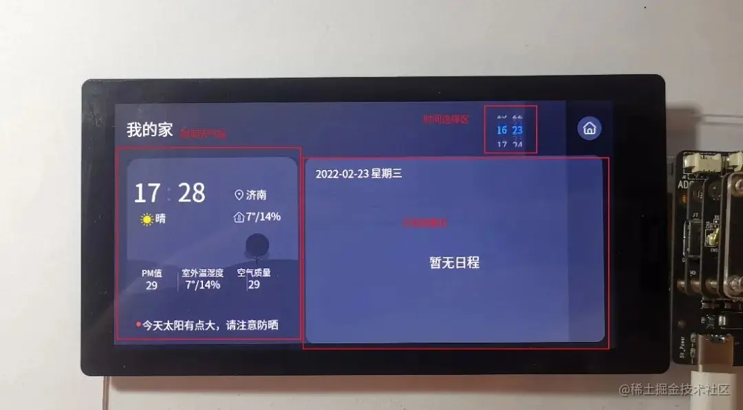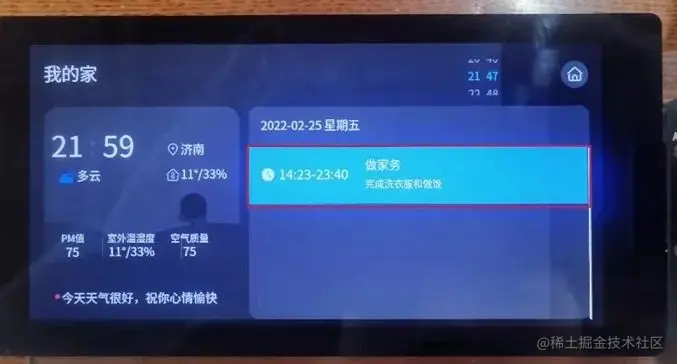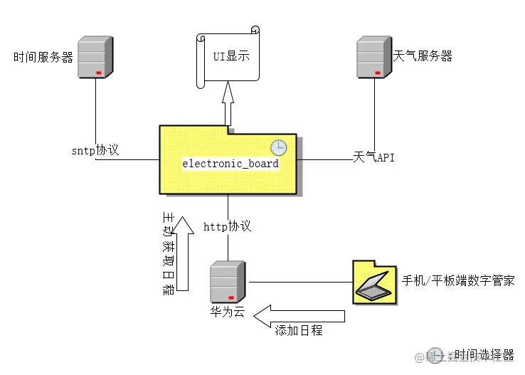 智能电子牌通过sntp协议主动于服务器获取实时时间;通过天气API实时获取天气信息,并且会根据天气状况给出一些暖心建议;通过http协议主动在华为云获取我们在手机或平板端数字管家中设置的日程,展示日程的起始终止时间,日程名与日程细节;通过在时间选择器中选择时间,可以起到定时提醒日程的作用。
