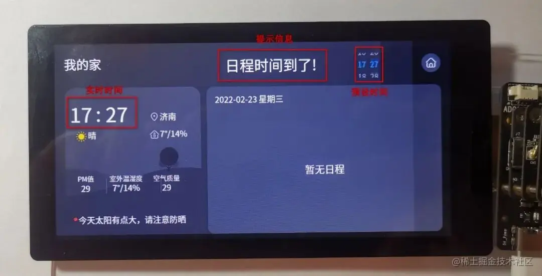 我们可以看到实时获取的时间天气(屏幕左半部分)与日程(屏幕右半部分)等信息,还可以通过滑动屏幕右上角的时间选择器选择提醒时间;日程信息包括日程的起始与终止时间,日程名与日程的执行细节等。