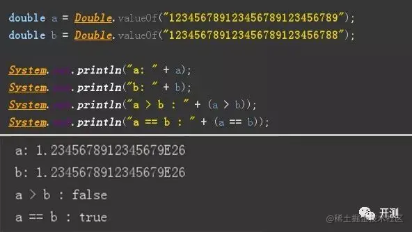 先看一个有趣的例子,如下图,使用java代码,声明两个double的变量a和b,值都是27个数字,a的末位数字比b的末位数字大1,其他位置的数字相同,a是大于b的,但是代码输出的结果是a等于b,a和b也变成了18个有效数字的科学计数。