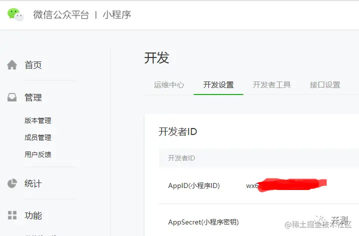 获取AppID的位置:小程序管理平台–>开发者设置–>开发者ID