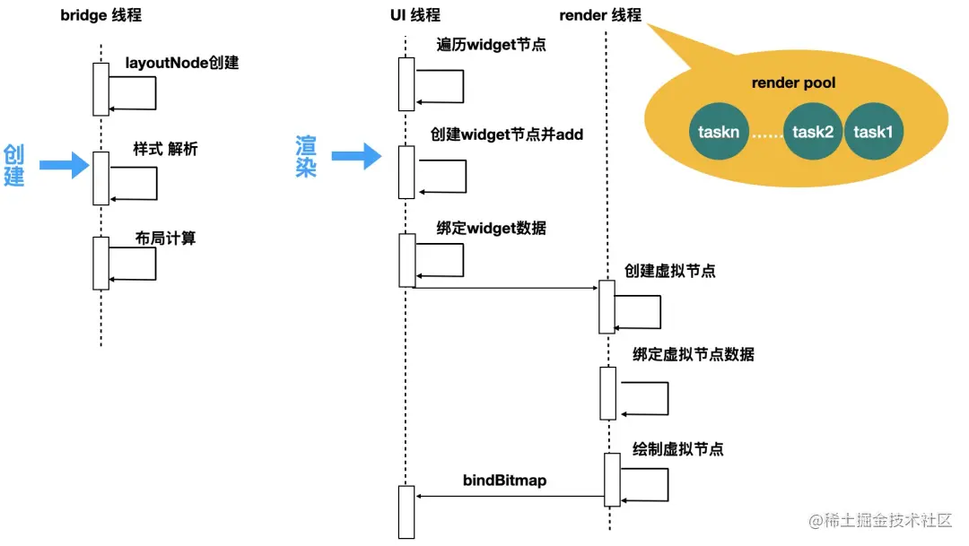 bridge 线程通过 DomApi 构建 layoutTree,当主线程触发渲染时,主线程根据 layoutTree 构建 RenderTree,构建过程中遇到外接实体组件,创建实例并 addSubView,之后切换子线程绘制 RenderTree,即 rootLayer 上的所有虚拟节点,绘制完成后切换主线程贴图(bitmap“产物”)。