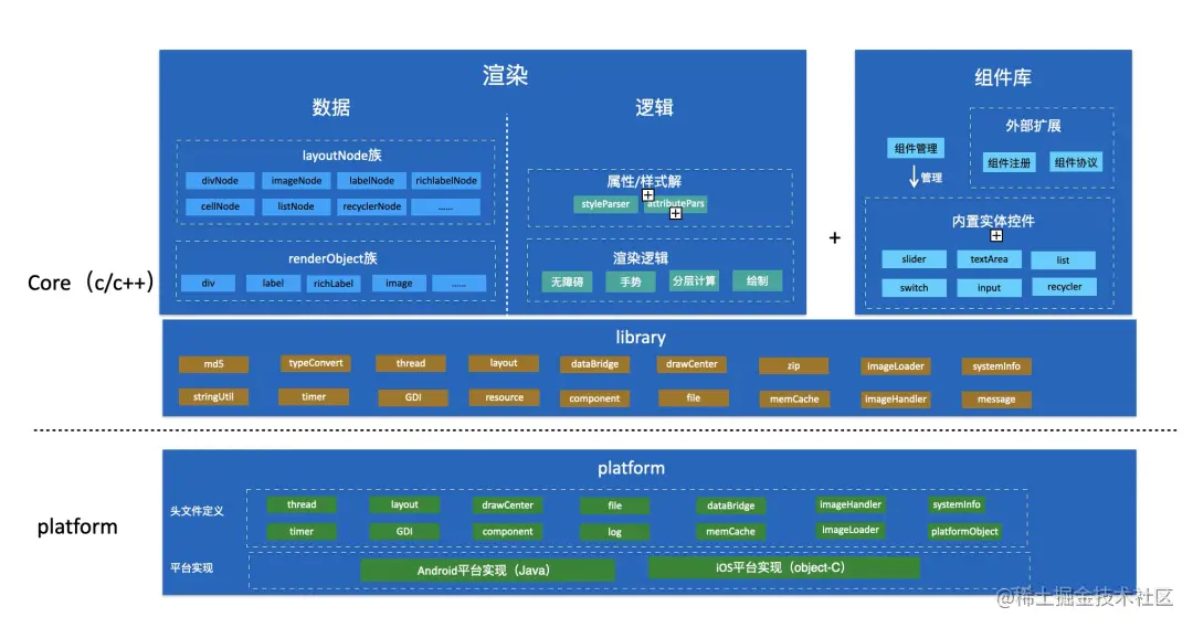 library 是基于 platform 原子接口用 c++ 实现的是基础库,例如文件 IO、UI 控件、图片下载、消息通讯等,供上层引擎使用。library 之上,就是 Cube 渲染的核心实现,渲染部分包括数据模型和渲染逻辑,组件库指 Cube 内部支持的一些系统实体控件,或者开发者可外接的实体组件。 下图是第一版 Cube 渲染架构图。