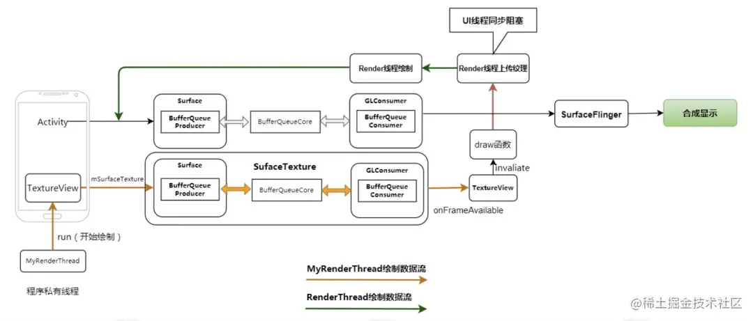 textureView 是 google 从 android 4.0 开始提供的,它的出现很大程度上是为了弥补 SurfaceView、GLSurfaceView 与原生 View 融合的不足,基于上面一节描述的这两个 View 与原生 View 一起动画的问题,textureView 似乎更适合我们的场景,既能支持独立 render 线程,又能保证与原生 View 完美融合。