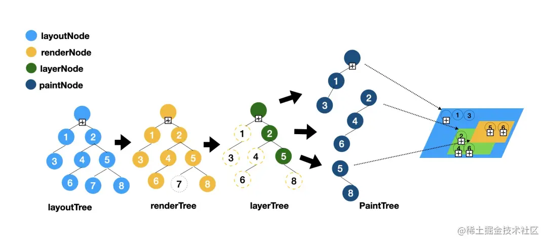 - RenderTree:用来描述绘制节点父子关系,包含绘制信息的树型结构,与 layoutTree 的区别举例:一个 layoutNode visible 为 gone,则该节点不会在 RenderTree 中出现;