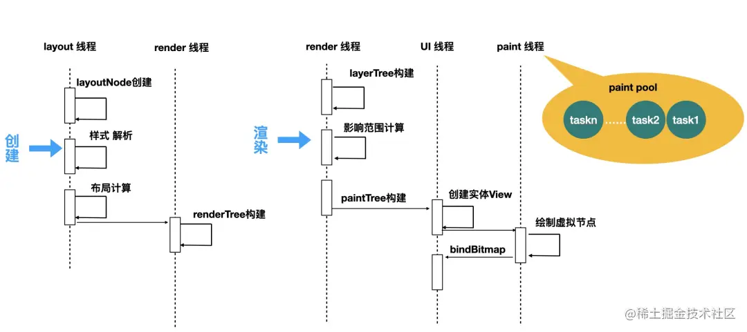 layout 线程构建 layoutTree,切换到 render 线程构建 renderTree,当平台层触发渲染,切换到 renderTree 构建 layerTree,并计算影响范围等,切换到主线程将 layer 对应的实体化 View 添加在容器 View 上,生成绘制任务在 paint 线程执行,绘制结束后切换主线程贴图(bitmap 产物)。
