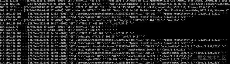 例如,我们的请求是通过Nginx转发的,那么可以通过Nginx的日志来获取请求数据,现有如下的log: