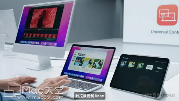 在功能上,全新的 Universal Control 让多个苹果生态内的设备可以进行协作,包括 MacBook、iMac、iPad 上进行文件的传递,当这些设备放在一起时,我们可以使用 MacBook 的鼠标、键盘和来对 iPad 和 iMac 进行共享操作,三块屏幕不再有局限。