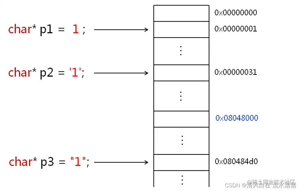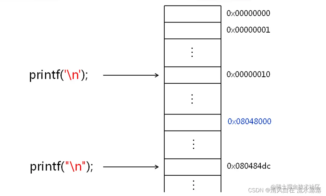 0x08048000 这个内存地址是非常特别的内存地址,所有低于这个地址的内存空间是不能随便访问的,一旦访问,就会发生段错误。程序里面的字符串编译之后得到的地址都是大于 0x08048000,所以在程序中可以访问。