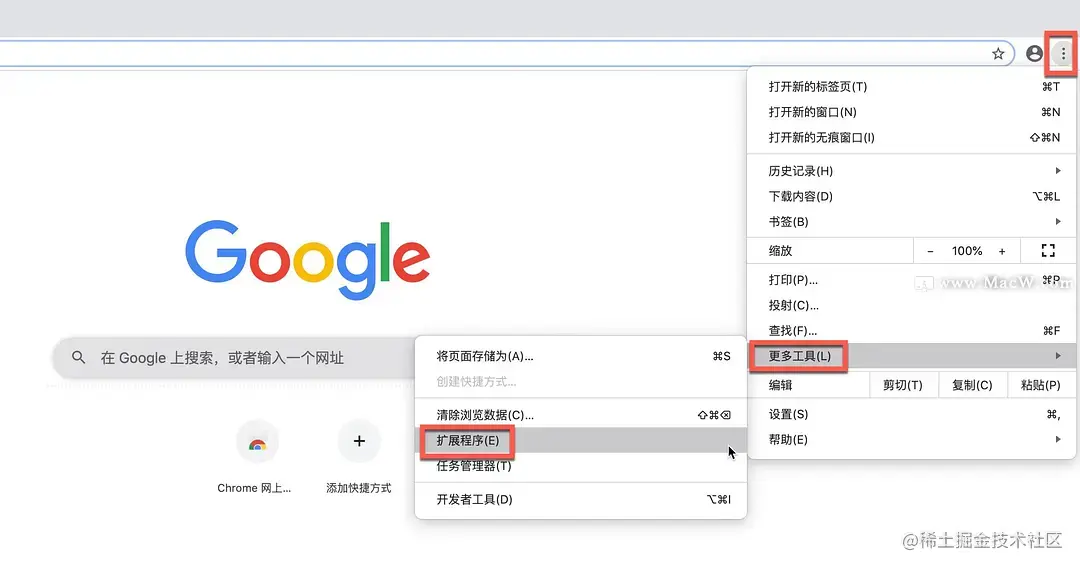 打开谷歌浏览器,点击右上角此处,在更多工具里打开扩展程序