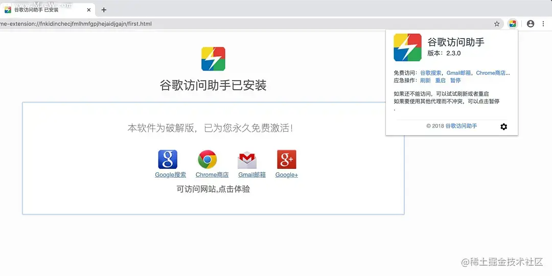 Chrome插件又称为谷歌浏览器插件,是谷歌Chrome浏览器的扩展插件,使用Chrome插件可以为Chrome浏览器带来一些功能性的扩展,进而提高Chrome的使用体验。小编为您带来这款谷歌访问助手2.3.0中文版,破除了12小时的限制,下载安装后,就可以直接访问,不需锁定任何主页,非常好用!