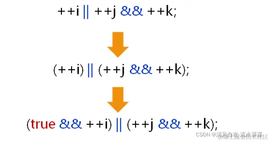 在 && 和 || 混合运算时,整个表达式被看作 || 表达式,编译器从左向右开始计算 && 表达式,当某个 && 表达式的值为真时,停止计算,整个表达式的值为真。
