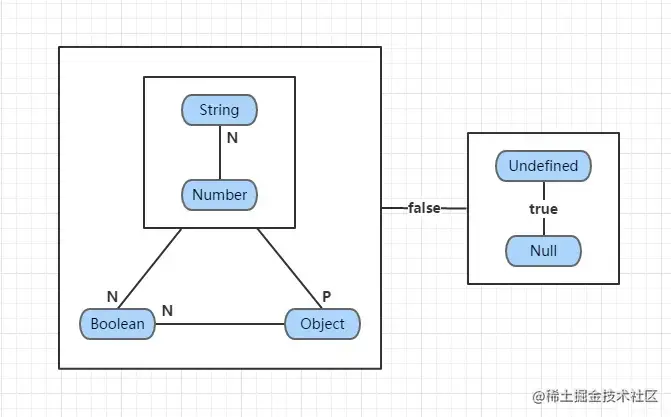 我们将JS数值类型按下图分成两组 : 右侧的Undefined和Null是用来表示不确定、无或者空的,而右侧的四种类型都是确定的、有和非空。我们可以这样说: