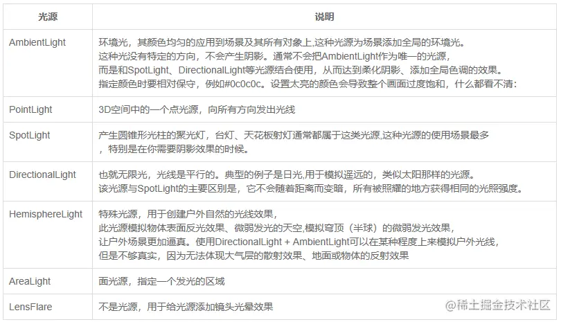 在Three.js中光源是必须的,如果一个场景你不设置灯光那么世界将会是一片漆黑。Three.js内置了多种光源以满足特定场景的需要。大家可以根据自己的项目需要来选择何种灯光。