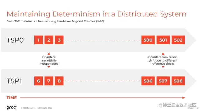 从概念上讲,这些计数器在机器刚复位时相互独立,然后将它们放入锁步(lock step),可能会随着时间的推移略有漂移,但我们会消除偏移并将它们重新放入锁步。这就是我们如何在分布式系统中保持同步行为的方法。
