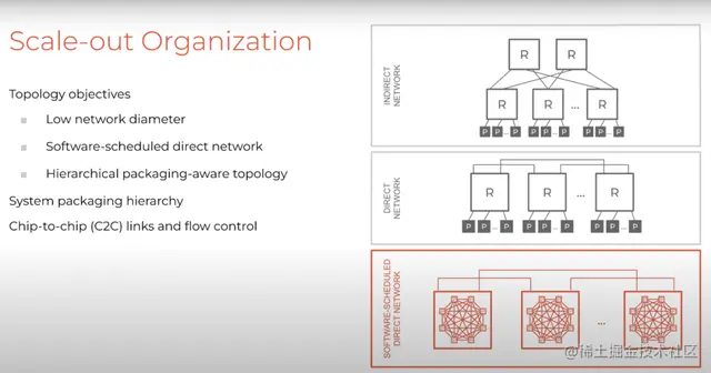 这种横向扩展排列方式非常独特。第一,它利用封装层次来制作低直径网络,这利用了蜻蜓拓扑(dragonfly topology),而蜻蜓拓扑又利用了封装局部性(packaging locality)。它创建了所谓的软件调度的直连网络(software-scheduled direct network),支持每个TSP上的16个直接相连的芯片到芯片链路进行通信。