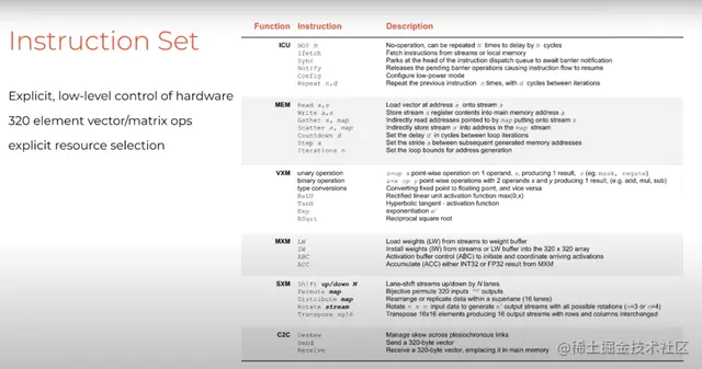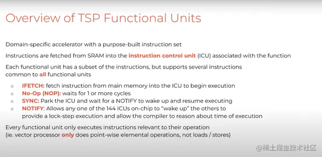 所以如果只看TSP的功能单元,每个功能单元都有一定数量必备指令,即取指、无操作(No-Op)和同步。这些是协调执行所必需的基本指令。
