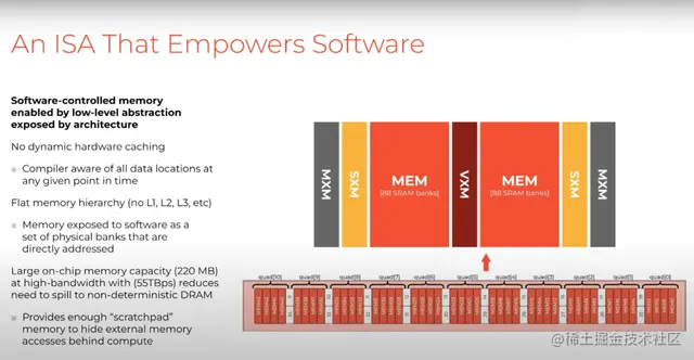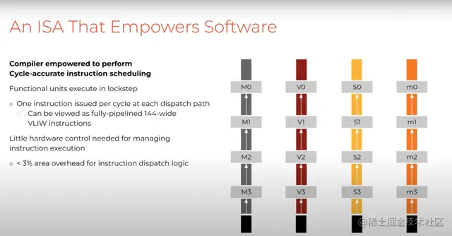 这种架构使得ISA能够赋能我们的软件堆栈。我们显式地将控制权移交给软件,特别是编译器,以便它可以从第一性原理的角度推断硬件上的正确性和调度指令。