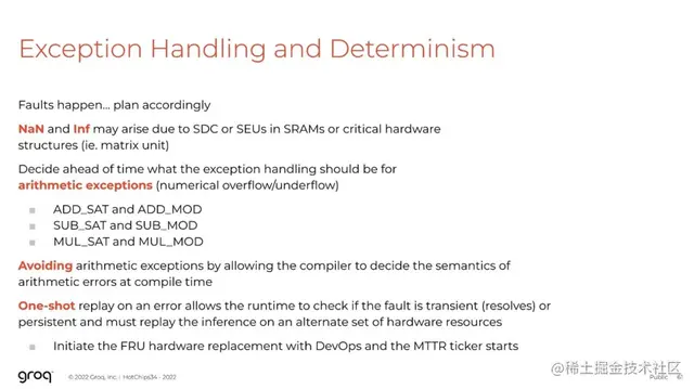 我们在整个系统中利用了TSP和网络内的冗余。例如制造良率的问题,芯片实际上是由21条超级通道构成的,而我们只使用了20条,因此可以允许出现一条无效的超级通道。这意味着我们可以在编译器中隐藏备用的超级链接,实际上也确实将硬件细节隐藏在其中。