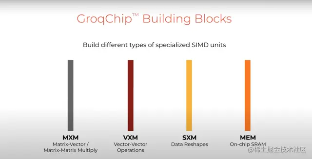 这些功能单元彼此相邻,正如软件的不同分类一样,这些不同的功能单元都有各自的用途,包括矩阵单元MXM,用于逐点运算的vector单元,用于数据重塑的SXM单元(开关执行模块),以及一个用于处理片上存储的存储器单元。