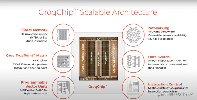 不同于传统的CPU和GPU架构,Groq从头设计了一个张量流处理器 (TSP) 架构, 以加速人工智能、机器学习和高性能计算中的复杂工作负载。这个架构不是开发小型可编程内核并对其进行数百次复制,而是容纳一个具有数百个功能单元的单个处理器。