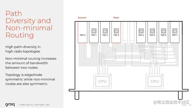 不同于传统网络依赖硬件判优机制来动态竞争一组输出端口,我们让编译器可以调度所有物理网络端口,使它可以像调度ALU或矩阵一样调度网络链接。传统方法只会对网络中的拥塞做出反应,而不是对拥塞做出反应后进行自适应路由,以试图改善因竞争而导致的热点(hot spots)问题。