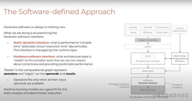 Groq将软件定义(software-defined)的方法引入到多处理器中软硬件接口的设置问题。具体来说,静态和动态(static-dynamic)界面来区分什么应该在编译时做,什么应该在运行时执行;软硬件接口由通过指令集架构(ISA, instruction set architecture )来实现,仅仅向编译器暴露必要的体系结构内部状态。
