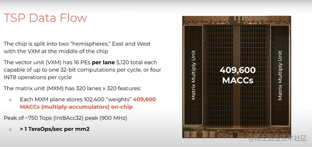 在芯片上的大型MXM模块是TSP架构的主力,该模块是矩阵单元,包含409,600个乘加器。换言之,我们可以通过芯片上的数据并行来利用大量权重参数,这使得我们能提供巨大的计算密度,每平方毫米硅面积超过1 TeraOps。