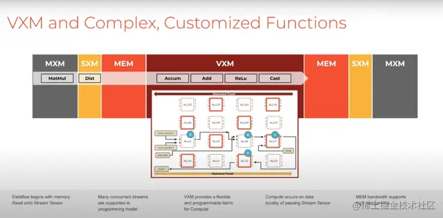 芯片的中间是矢量执行模块(VXM,vector execution module),它是机器学习模型中常见的向量逐点运算,例如GELU或ReLU,并且向量单元中存在其他超越函数(transcendental functions)以利用逐点操作。