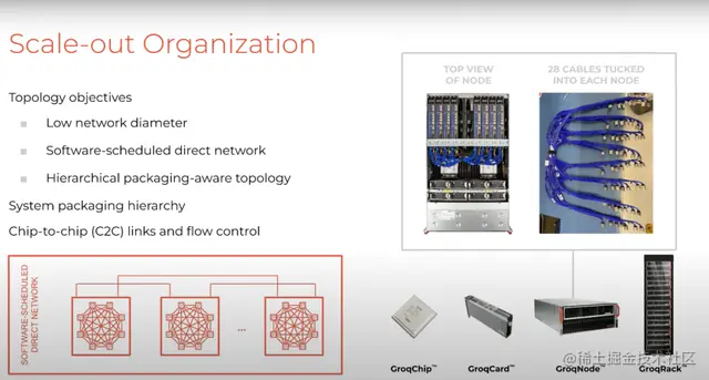 横向扩展组织利用较小的网络直径将多达8个芯片打包到一个节点中,这8个芯片使用28根电线连接到它们的7个中转点,这些电线被放置在每个节点底层,使我们能够丰富地连接单个节点内的8个TSP,以再次利用封装的局部性。这些节点使用电线连接,较长的电线将在机架到机架网络(rack-to-rack network)之间使用光缆。