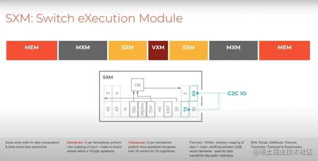 最后,SXM(switch execution module)是一个开关执行模块。SXM就像是一把瑞士军刀,来处理数据操作、数据重塑、片上数据搬运和片外数据搬运。如上图所示,C2C IO、PCIE也由这个SXM单元处理。