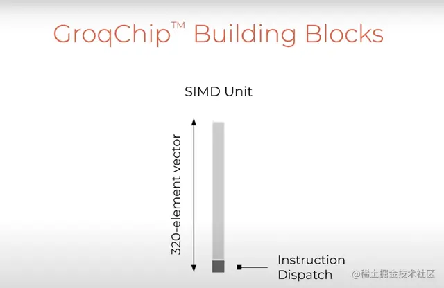现在往回看,来看看GroqChip的抽象构造。芯片上有多个不同的功能单元,这些单元组成了简单的构建块,长度为320个元素(本处所指的是SIMD单元),每个SIMD单元由指令调度单元(位于芯片底部)控制。