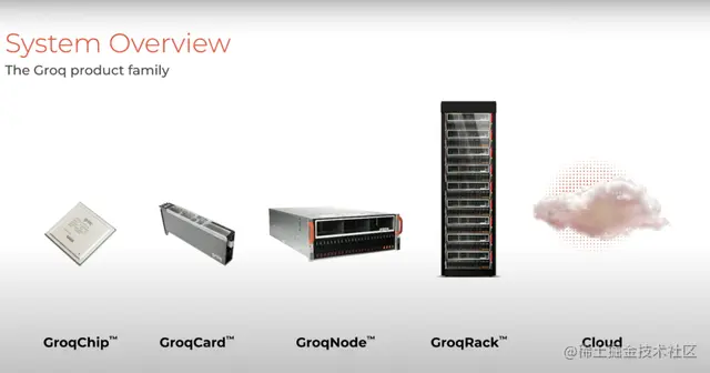 接下来如何将这些组件封装,进而组建成一个系统?首先是将GroqChip与散热器封装在一张卡上,然后将八张这种卡集合成一个GroqNode,最后再将八个GroqNode加一个备用包打包到一个GroqRack中,并使其在云端也可访问。
