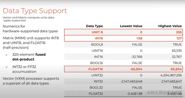 硬件本身支持的数据类型是INT8、UINT8以及FLOAT16,处理逐点元素的向量处理器支持包括FP32在内的超集。